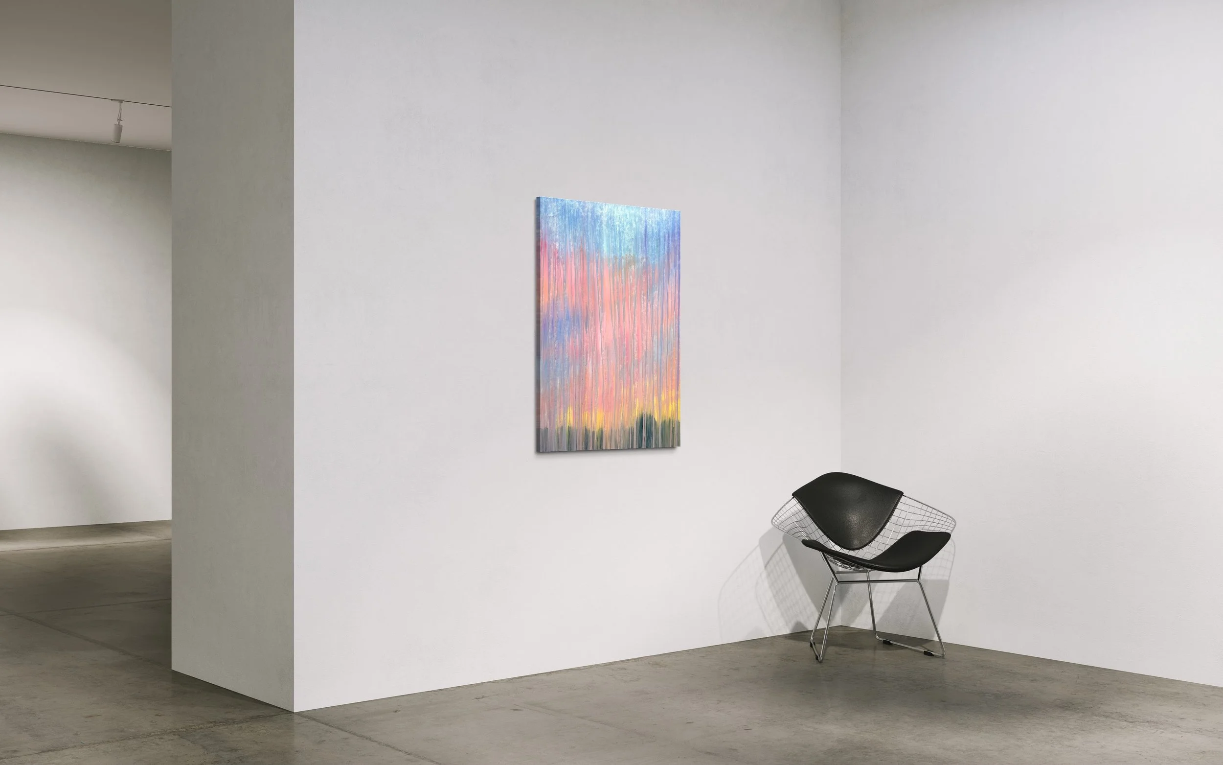 The painting is inspired by the very still, windless surface of this lake at sunset, the magnificently gorgeous sunset sky illuminating and reflecting off the stillness of the lake surface, and contrasting against the softened lines of the hills across the water in the distance. Imagine all this viewed through the lense of a window when it’s pouring rain, and you get this imagery.