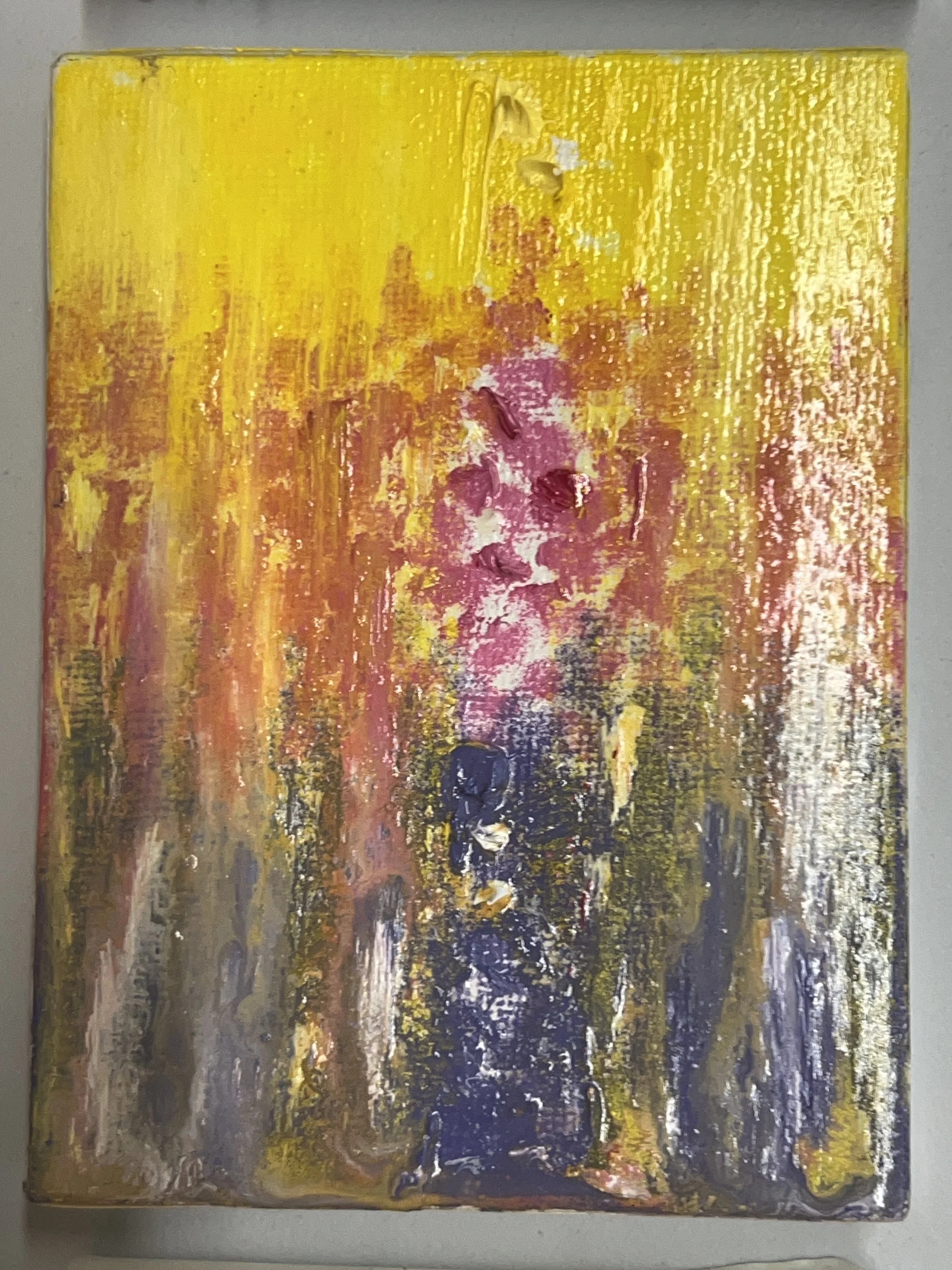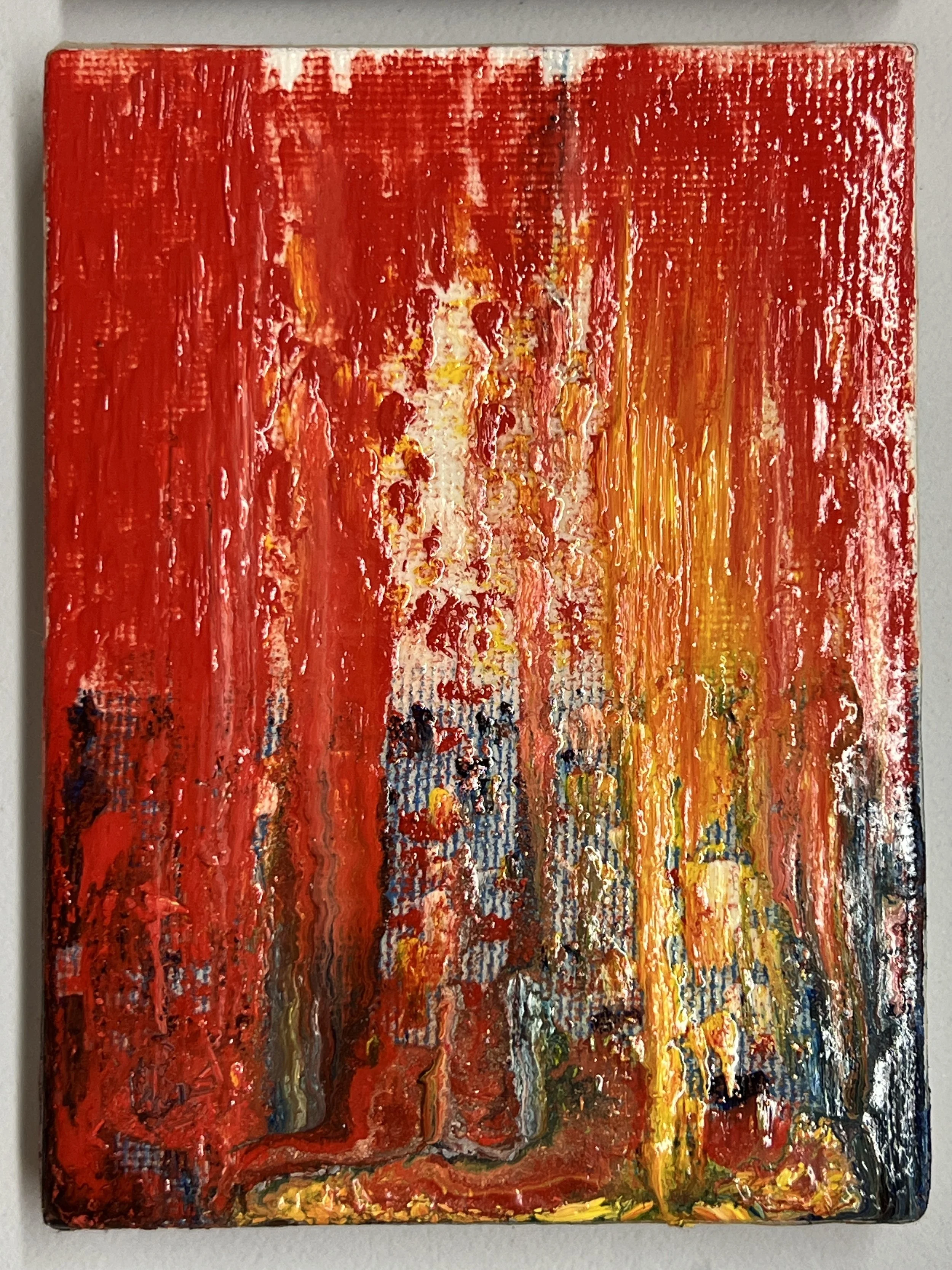 2025 Collection of Mini-Painting Ornaments by Rachel Brask. Each mini-painting is an original oil painting created by Rachel Brask on a 3x4” canvas. Each canvas is signed, comes with a small display easel, and is affixed with a hanging wire that can be used to hang the painting as a holiday ornament on a tree, or to simply hang it on a wall, but can be tucked away easily to be displayed on the easel.