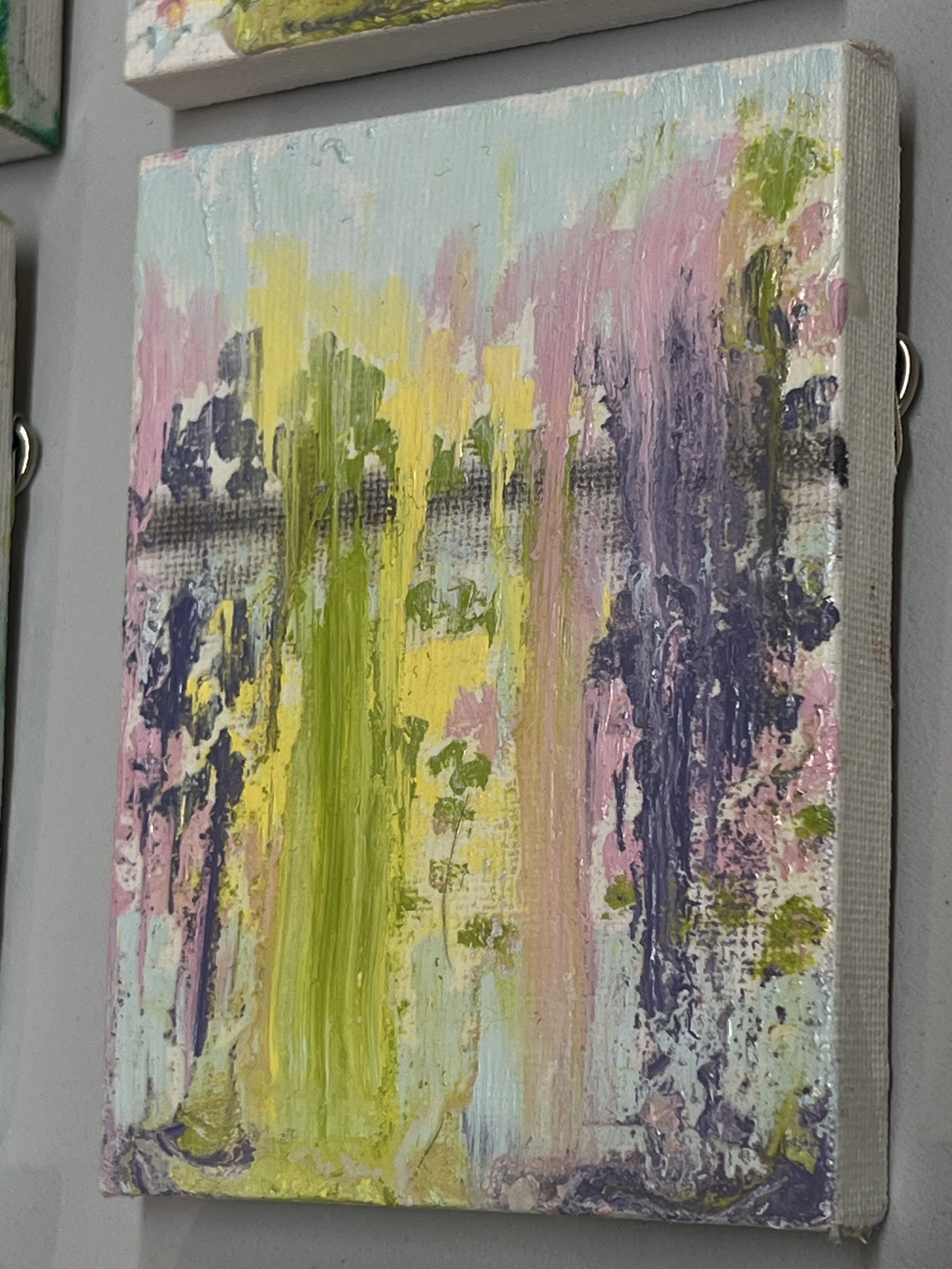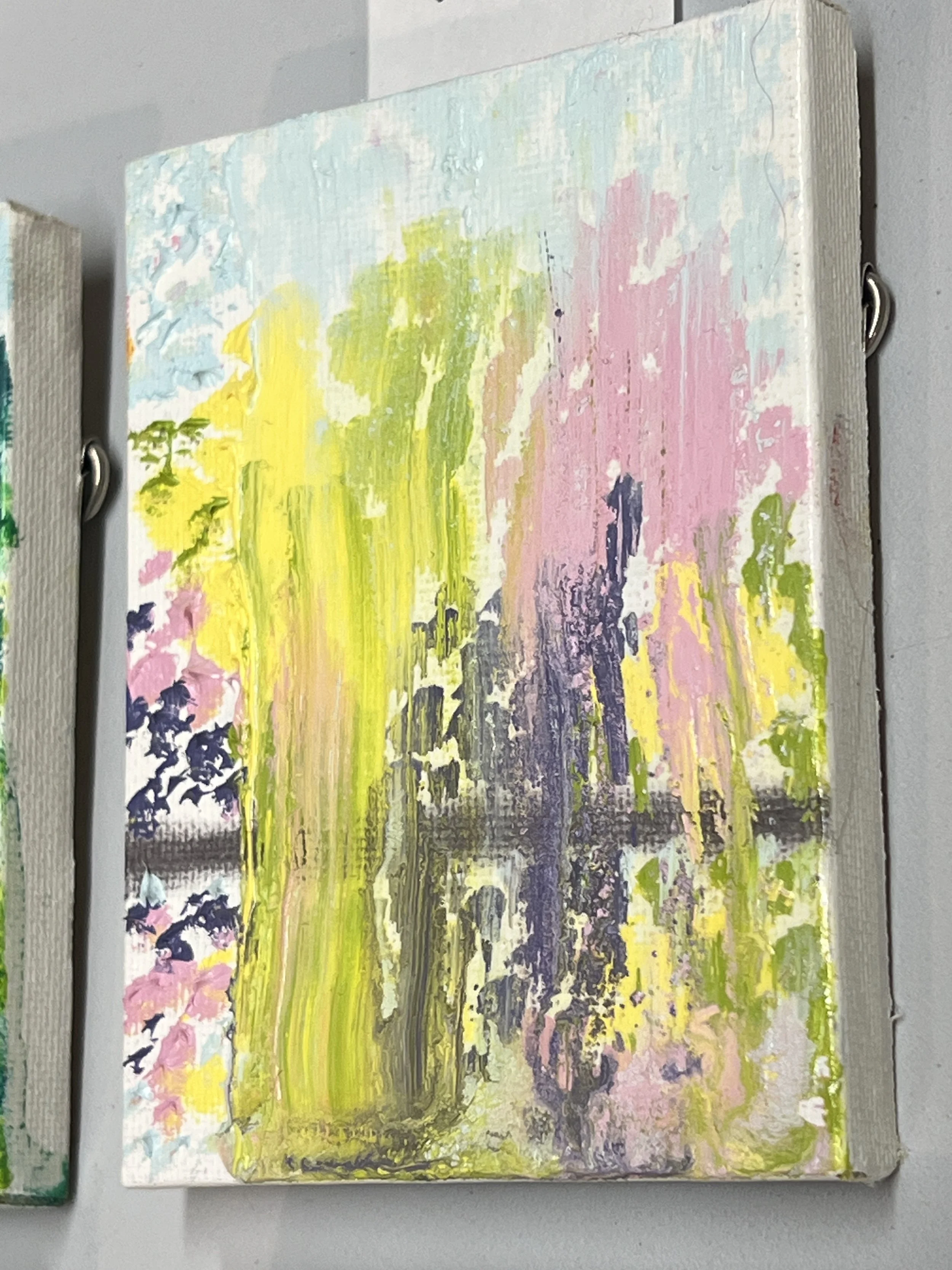 2025 Collection of Mini-Painting Ornaments by Rachel Brask. Each mini-painting is an original oil painting created by Rachel Brask on a 3x4” canvas. Each canvas is signed, comes with a small display easel, and is affixed with a hanging wire that can be used to hang the painting as a holiday ornament on a tree, or to simply hang it on a wall, but can be tucked away easily to be displayed on the easel.