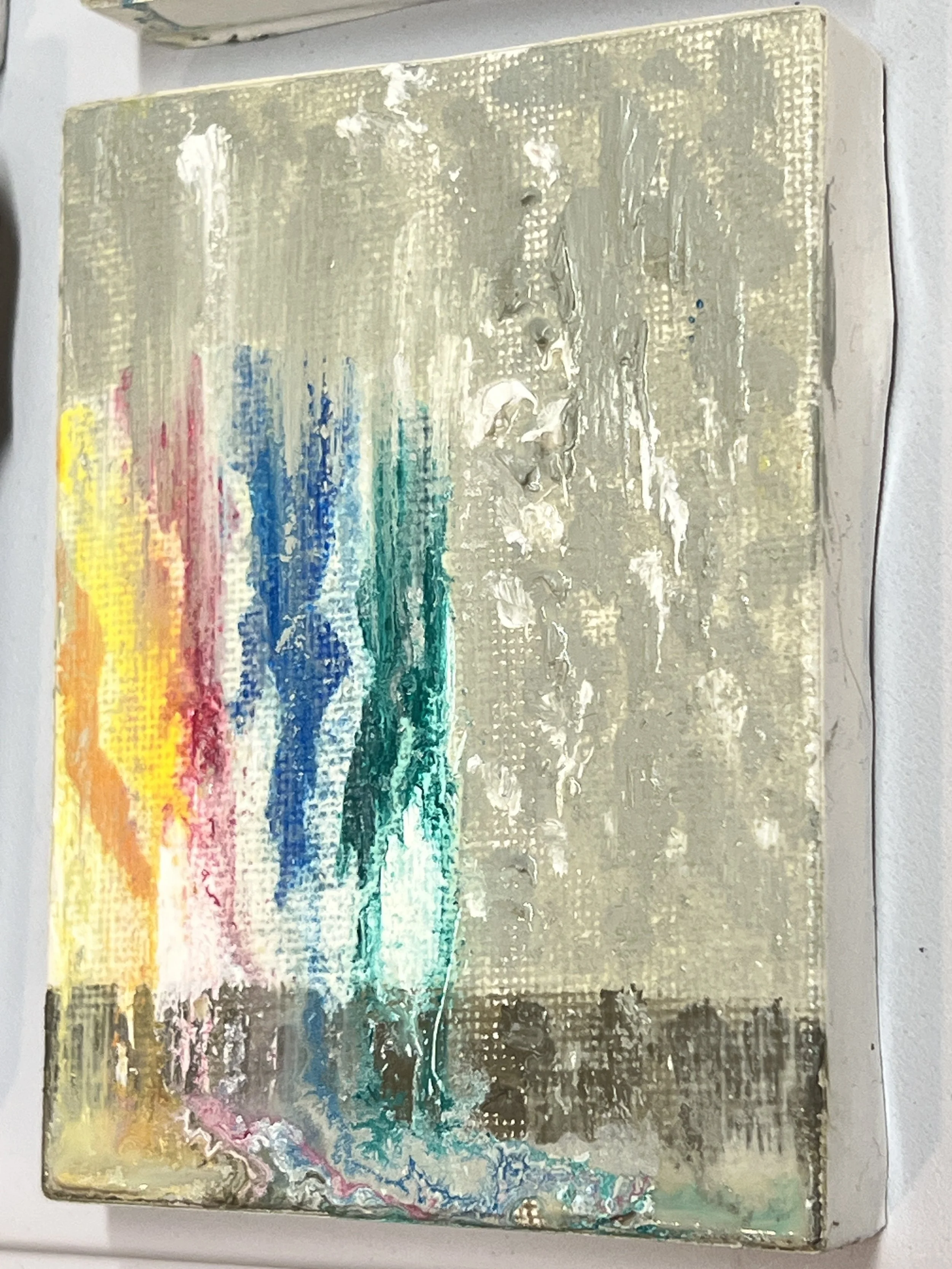 2025 Collection of Mini-Painting Ornaments by Rachel Brask. Each mini-painting is an original oil painting created by Rachel Brask on a 3x4” canvas. Each canvas is signed, comes with a small display easel, and is affixed with a hanging wire that can be used to hang the painting as a holiday ornament on a tree, or to simply hang it on a wall, but can be tucked away easily to be displayed on the easel.