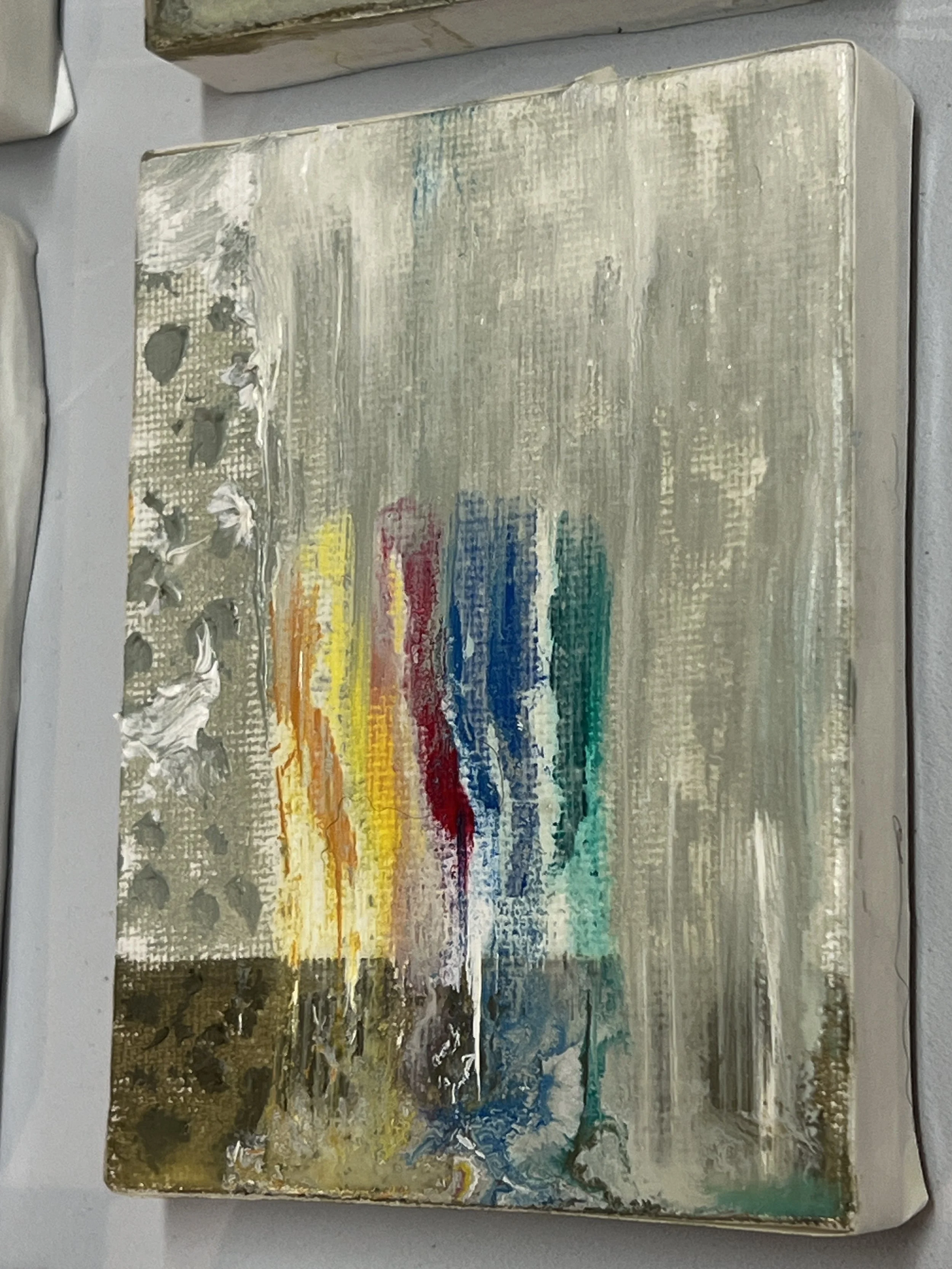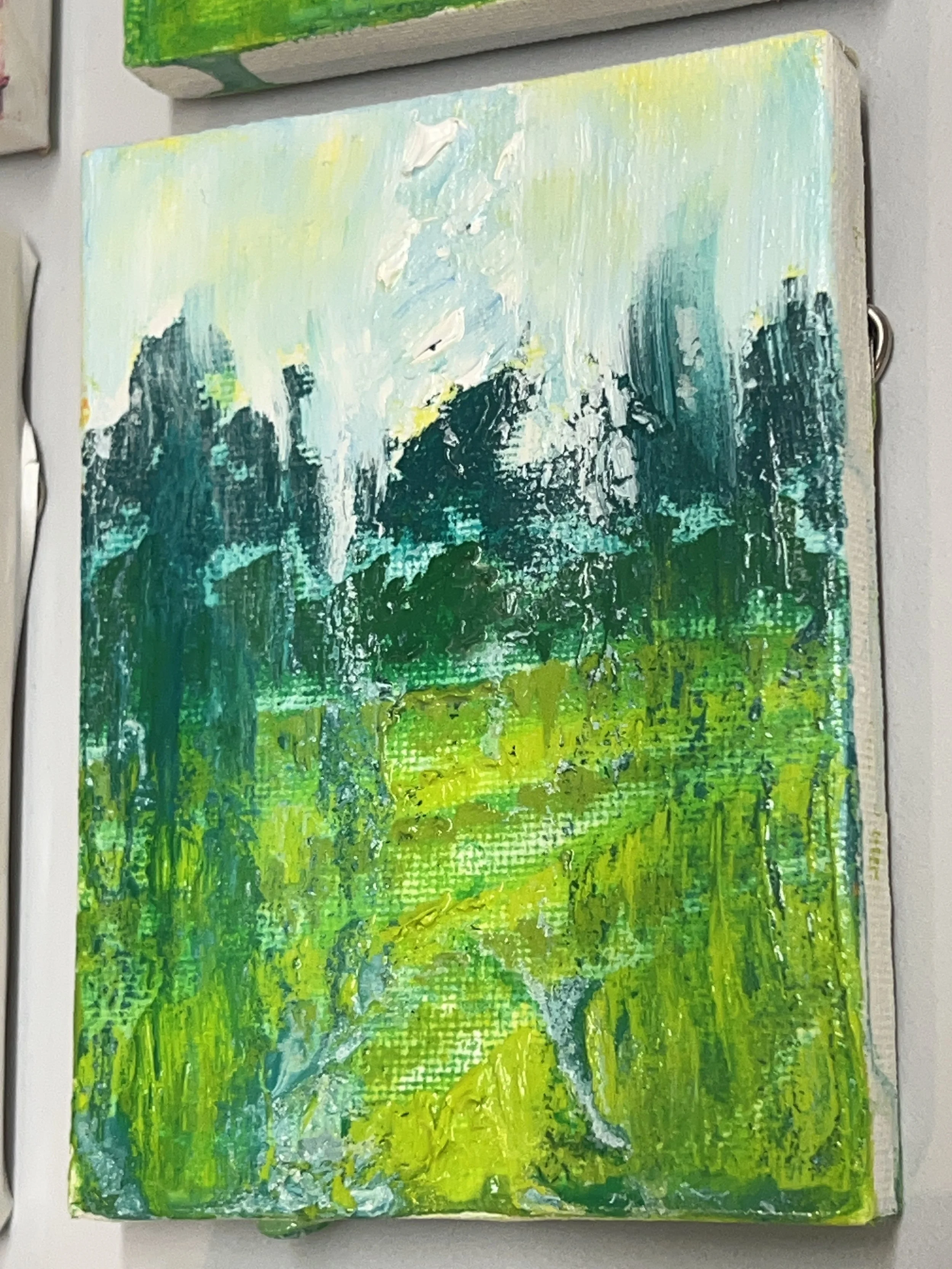 2025 Collection of Mini-Painting Ornaments by Rachel Brask. Each mini-painting is an original oil painting created by Rachel Brask on a 3x4” canvas. Each canvas is signed, comes with a small display easel, and is affixed with a hanging wire that can be used to hang the painting as a holiday ornament on a tree, or to simply hang it on a wall, but can be tucked away easily to be displayed on the easel.