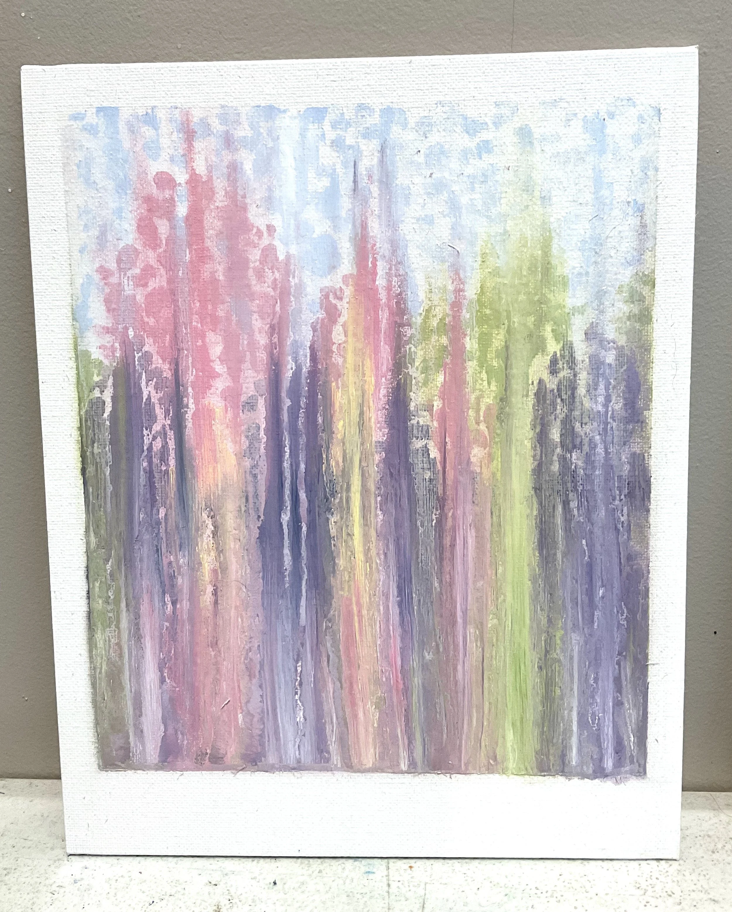 The canvas profile is a half-inch thick and the painting colors continue onto the outer edges. Painting comes affixed with hanging hook and is signed by the artist.